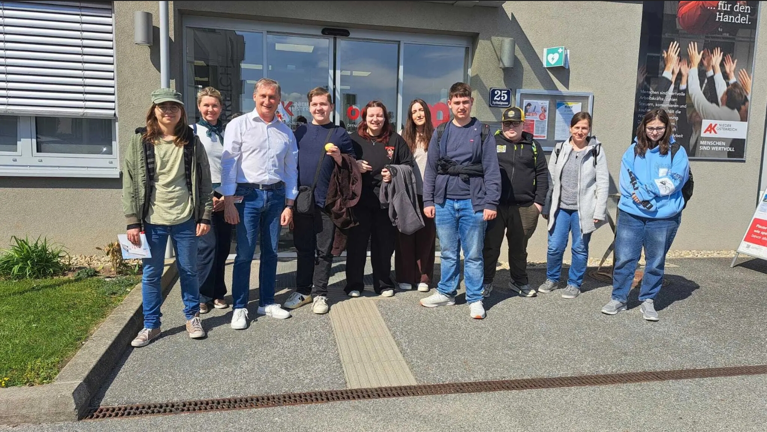 Über 20 junge Menschen aus der Lehrlingsstiftung Eggenburg besuchten die Arbeiterkammer Horn und diskutierten mit Bezirksstellenleiter Andreas Riedl über Arbeit und Ausbildung. Die AK gab dabei einen Einblick in seine Tätigkeit und stellte aktuelle Themen rund um Arbeitswelt, Rechte am Arbeitsplatz sowie Ausbildungs- und Beschäftigungsmöglichkeiten vor. In einer offenen Gesprächsrunde über rund eineinhalb Stunden wurden Fragen der Jugendlichen aufgegriffen. Dabei ging es sowohl um persönliche Wünsche und Befindlichkeiten als auch um konkrete Perspektiven im Berufsleben und in der Ausbildung.